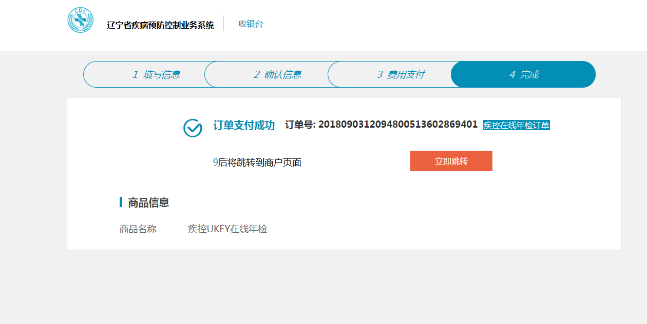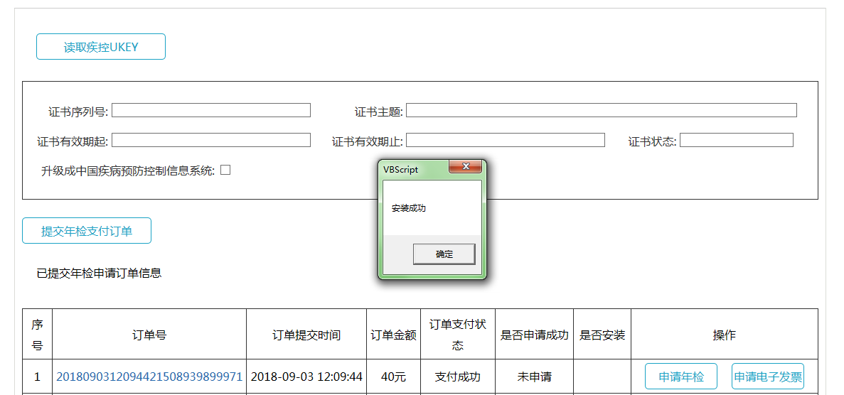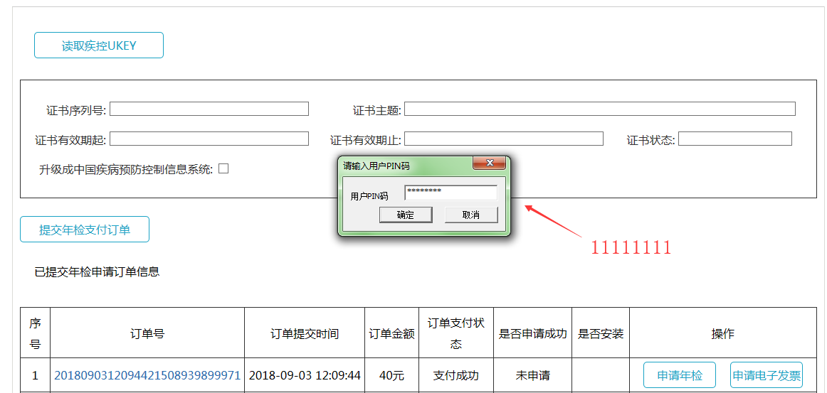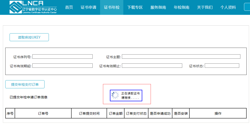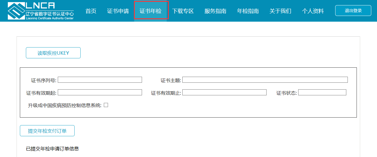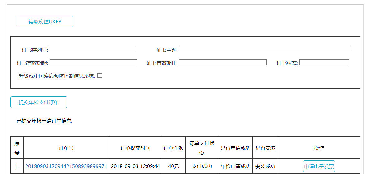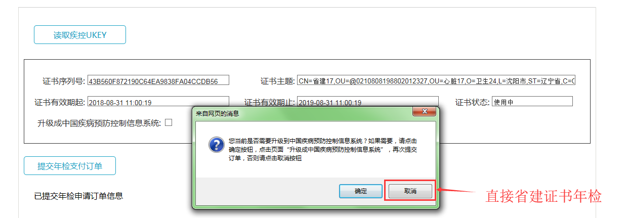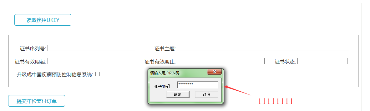 点击读取疾控UKEY按钮,此时证书信息将会显示在界面上,点击“提交年检支付订单”,如图所示