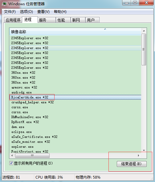 如果证书助手还是没有退出,则需要在任务管理器中进行删除,找到红框中的进程,点击结束进程。如图所示