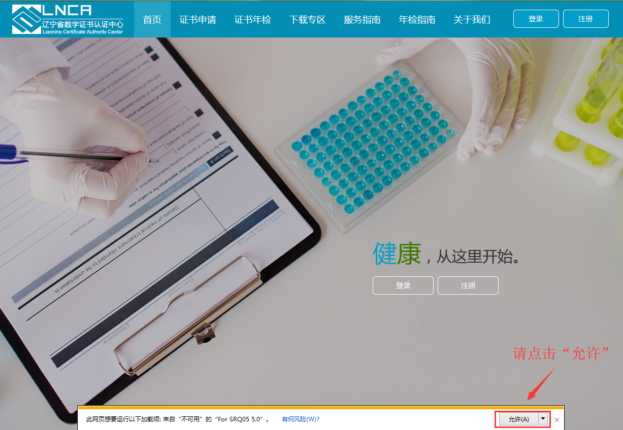 安装完毕,刷新页面,如下图会再弹出一个提示框,请点击“运行”,进行安装SRQ05 5.0(也可以在登录系统后,根据提示进行安装)。